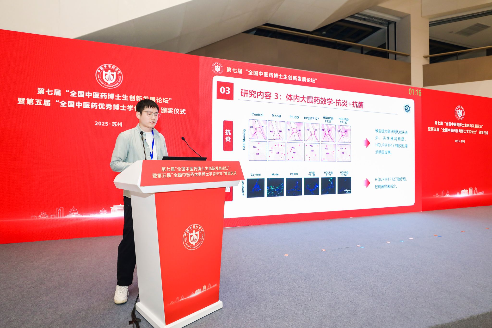 在第七届“全国中医药博士生创新发展论坛”上,经过严格评审和答辩,我校2024级中药学博士生王桂春(导师桂双英教授)的论文《多功能水凝胶靶向内质网应激促牙周再生》荣获“优秀论文二等奖”,2024级中医专博生陈祝越(导师谢道俊教授)的论文《谢道俊教授基于丹溪学说探讨中西医结合论治情志病经验撷粹》获优秀奖。充分展现了学校在中医药创新人才培养方面的卓越成效。